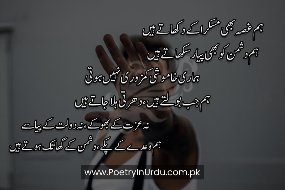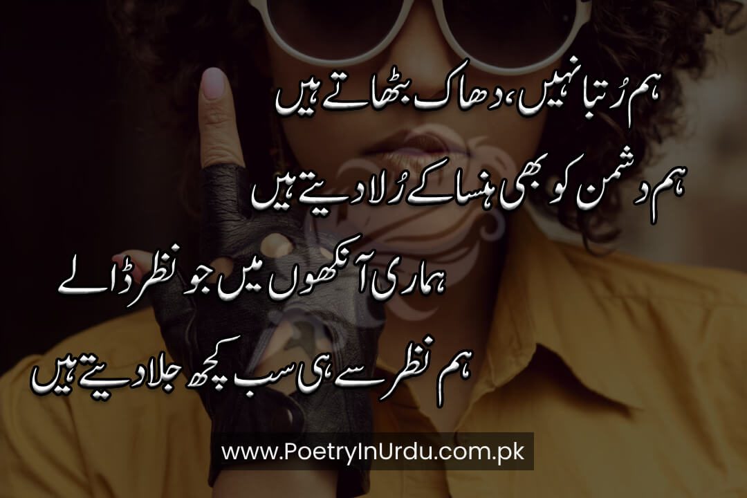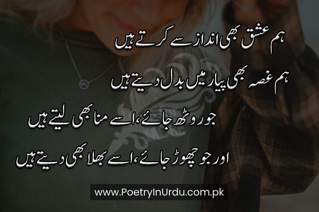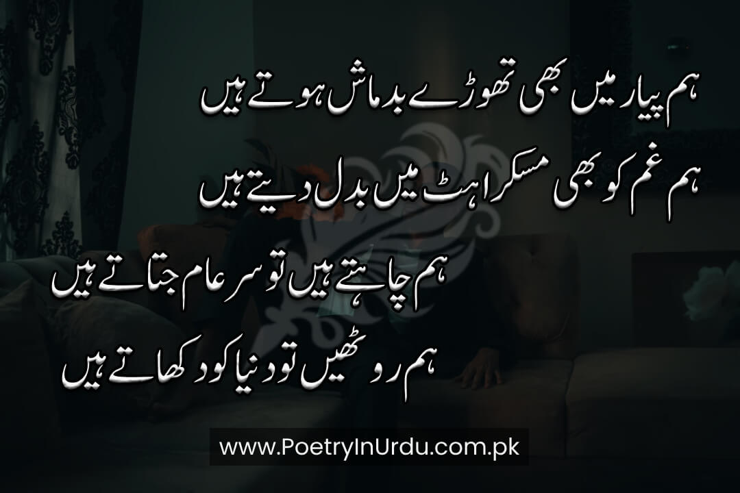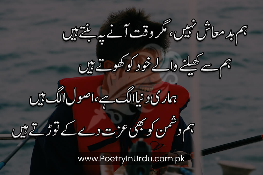 Badmashi Poetry is all about attitude, power, and fearless vibes. These bold and powerful verses talk about self-respect, friendship, and standing strong against enemies. In this collection, you will find badmashi poetry in Urdu, poetry on attitude, and even badmashi love poetry that shows style and passion in relationships. From lines that inspire respect to those that warn enemies, every verse carries confidence and swag. If you like poetry with a touch of attitude and a fearless tone, this is the perfect collection for you.