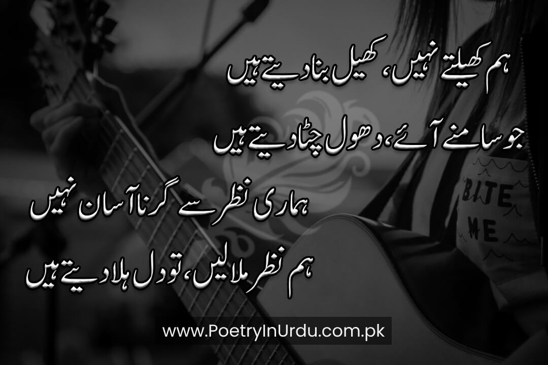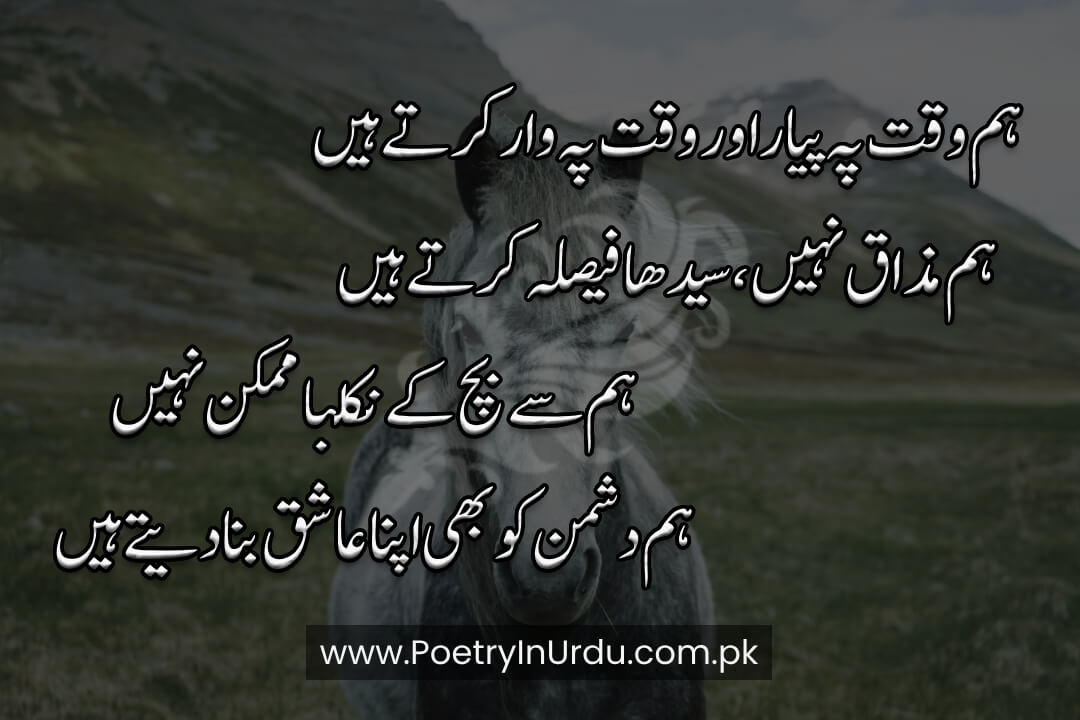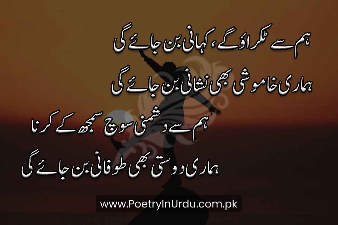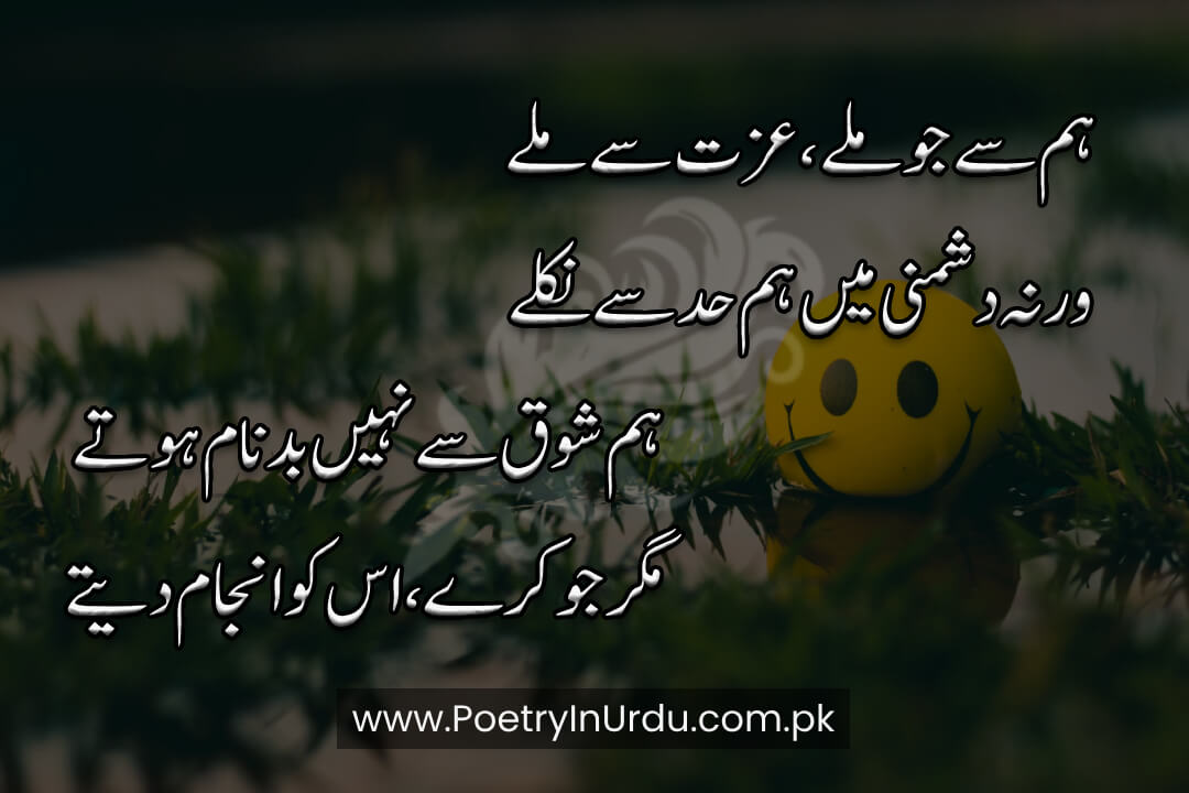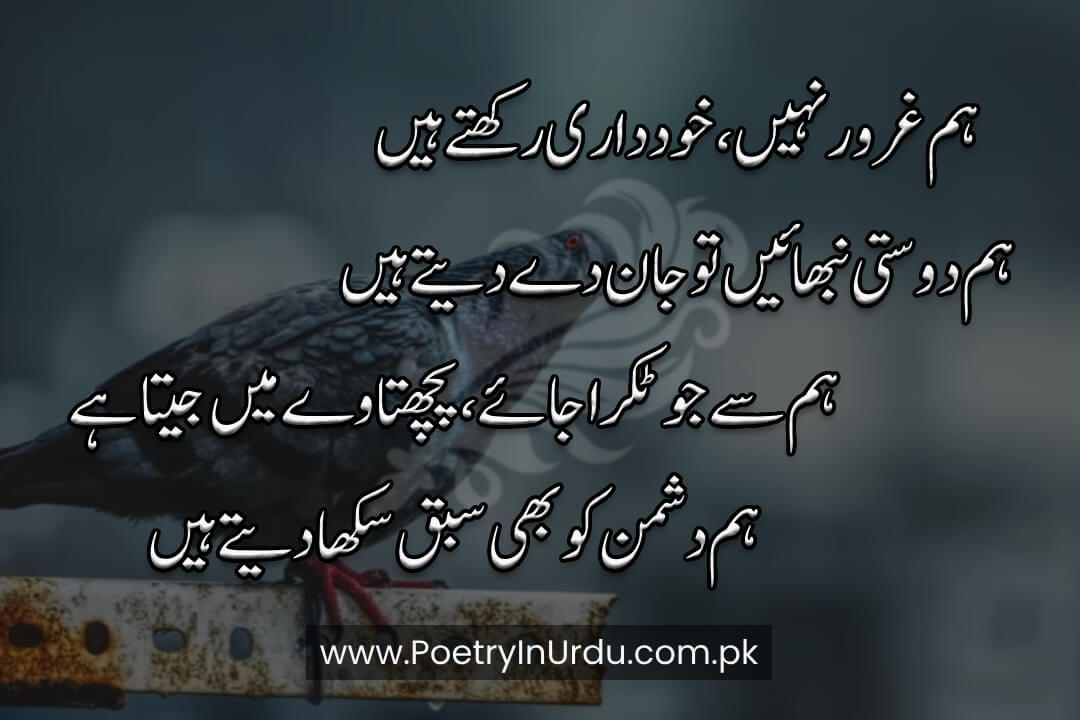 Badmashi Poetry is all about attitude, power, and fearless vibes. These bold and powerful verses talk about self-respect, friendship, and standing strong against enemies. In this collection, you will find badmashi poetry in Urdu, poetry on attitude, and even badmashi love poetry that shows style and passion in relationships. From lines that inspire respect to those that warn enemies, every verse carries confidence and swag. If you like poetry with a touch of attitude and a fearless tone, this is the perfect collection for you.